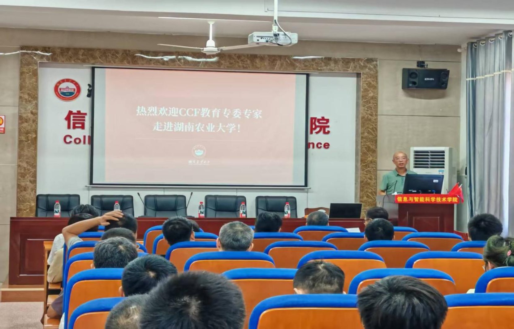 活动在湖南农业大学 13 教 504 报告厅开启,副校长杨国顺教授热情致辞,对专家们的到来表示热烈欢迎。他指出,ccf走进高校活动是提升学校计算机教学科研水平、促进专业人才发展的关键举措,并重申了学校对计算机科学与技术专业发展的重视与支持。