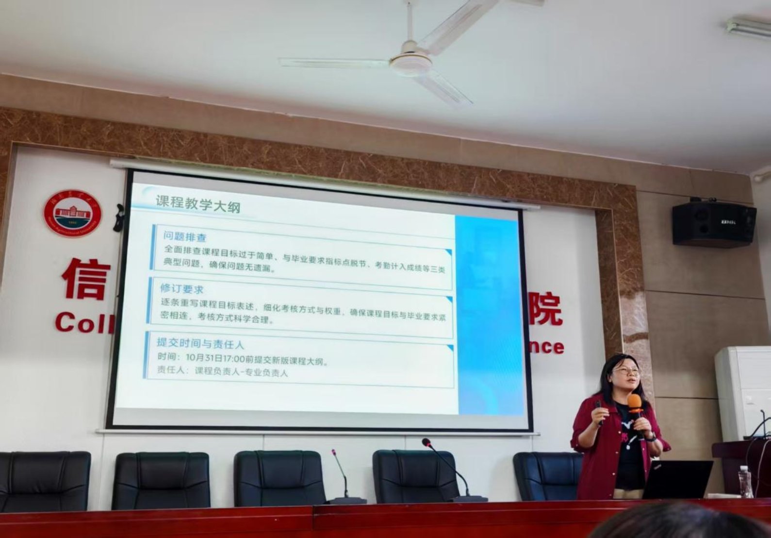 接着,张红燕围绕评估时间安排、教学材料规范、课堂质量提升、现场考察安排四大板块展开汇报。她强调,人才培养方案是学院人才培养的 “纲领性文件”,要强化毕业要求对培养目标的支撑,其中工科专业需对照《工程教育专业认证毕业要求》对毕业要求进行修订,各专业需梳理完善毕业要求与课程的对应支撑关系。教学大纲中应明确课程目标与毕业要求指标点的对应关系,并阐明课程考核成绩的构成。在教案设计上,需从知识、能力、素质层面紧扣课程目标,融入前沿案例与课程思政,践行“以学生为中心”的理念,通过互动探究式教学激发学生创新思维,设计梯度化学习任务以体现课程高阶性、创新性与挑战度。此外,她还以李维老师的教案、拜战胜老师的课程考核归档材料及王奕老师的试卷分析报告为范例,要求任课教师对近两年开设课程的考核材料完整性、规范性进行全面核查,对试卷分析报告进行完善,并阐述课程目标达成情况分析。